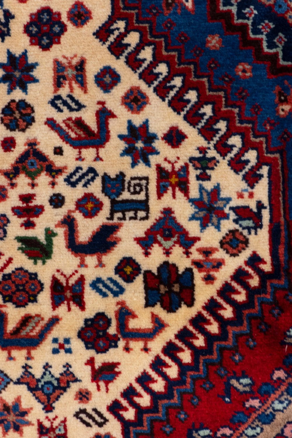 ترکیببندی اصیل با محوریت حوضهای سهگانه: زمینه این فرش، به رنگ کرم است؛ رنگی آرام، متعادل و بسیار هوشمندانه که بستری مناسب برای نمایش جزئیات فراوان طرح فراهم کرده است. در مرکز فرش، ردیفی از سه حوض دیده میشود که ساختاری نمادین و کلاسیک در هنر فرش ایرانی دارد. حوض میانی به رنگ آبی بافته شده و دو حوض کناری، قرمز هستند؛ ترکیبی که هم از نظر بصری چشمنواز است و هم یادآور باغهای ایرانی و مفهوم زندگی و جریان آب.