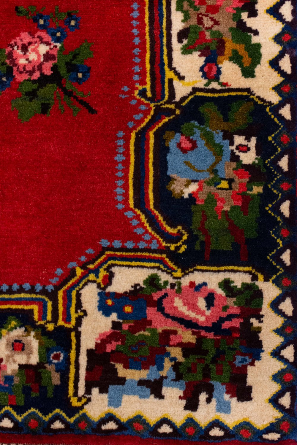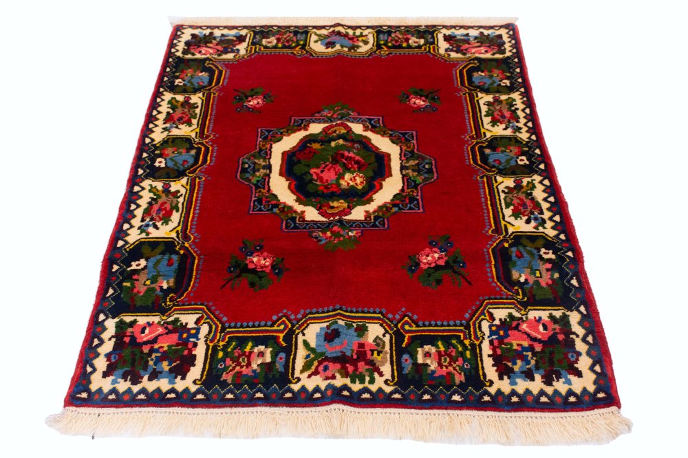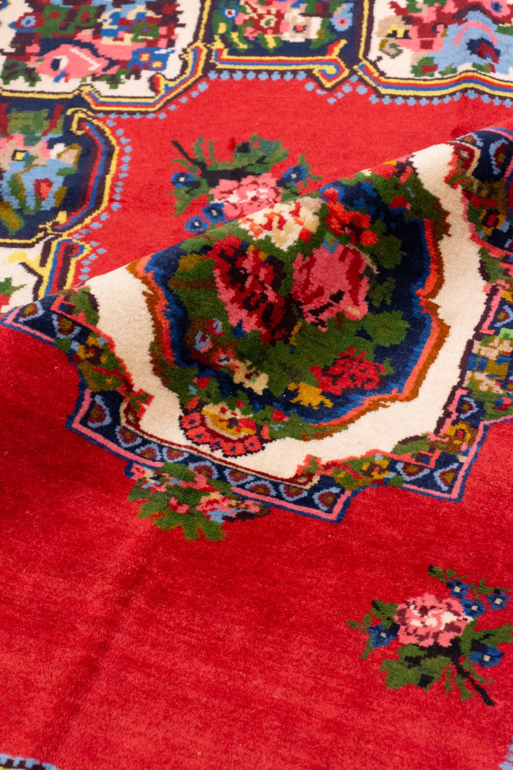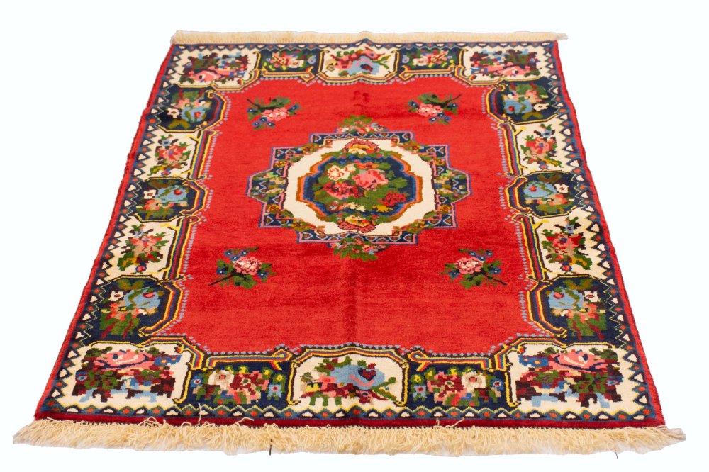 فرش دستباف گلفرنگ فرادنبه، زمینه مسی با نقشهای اصیل گل ایرانی