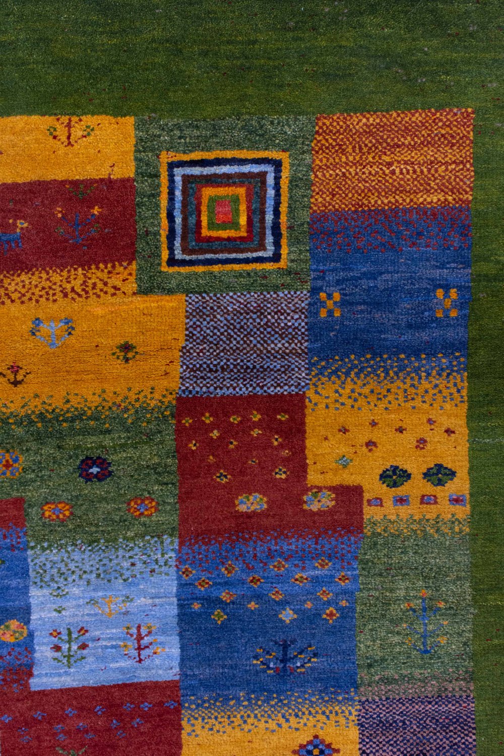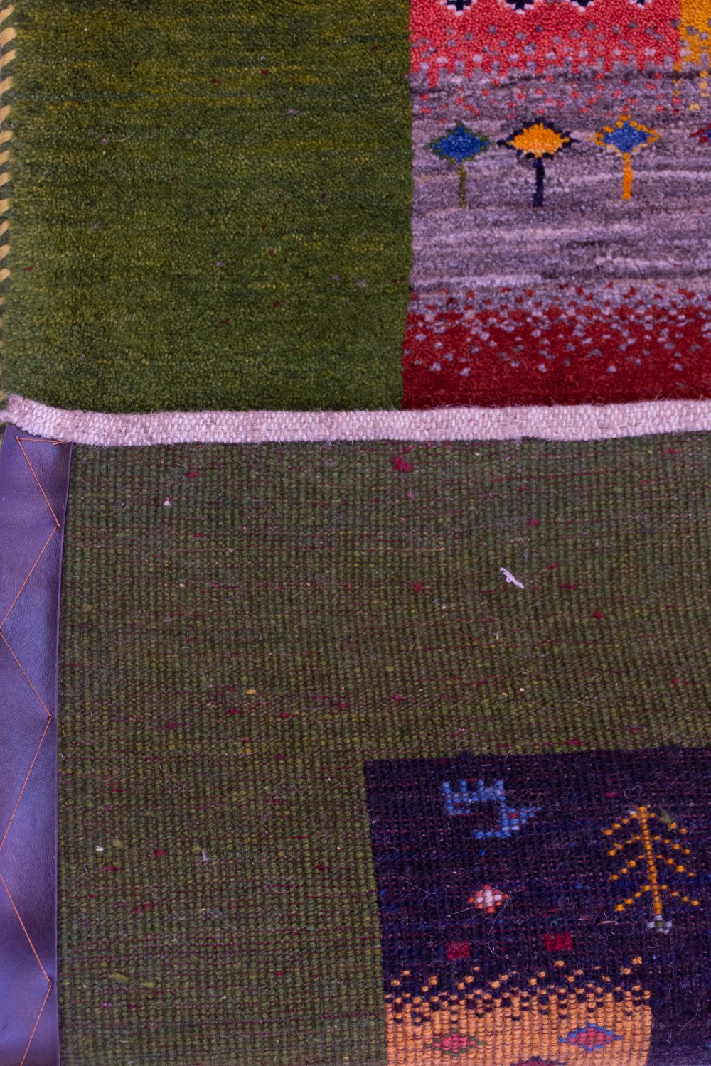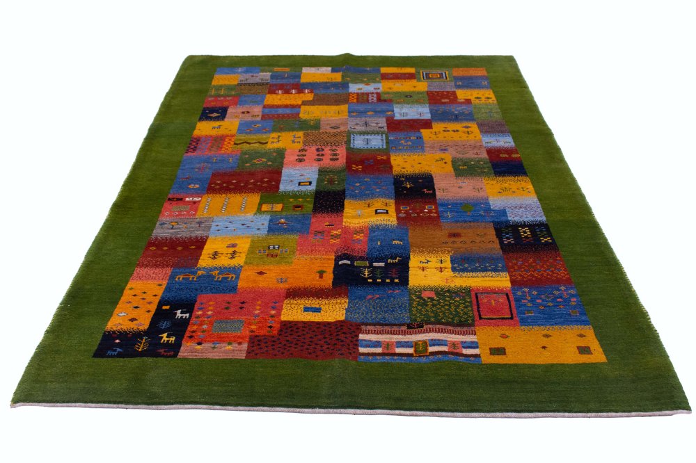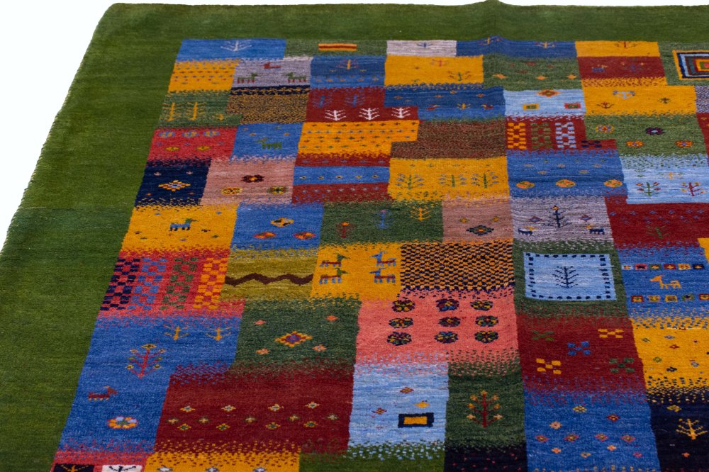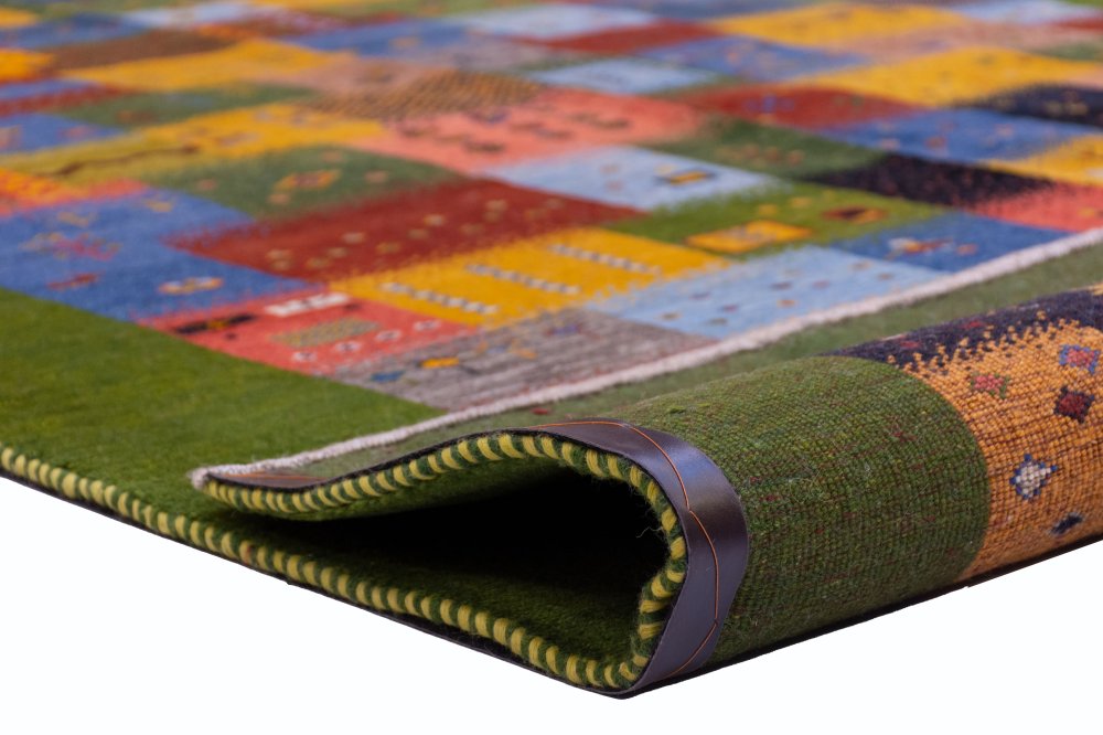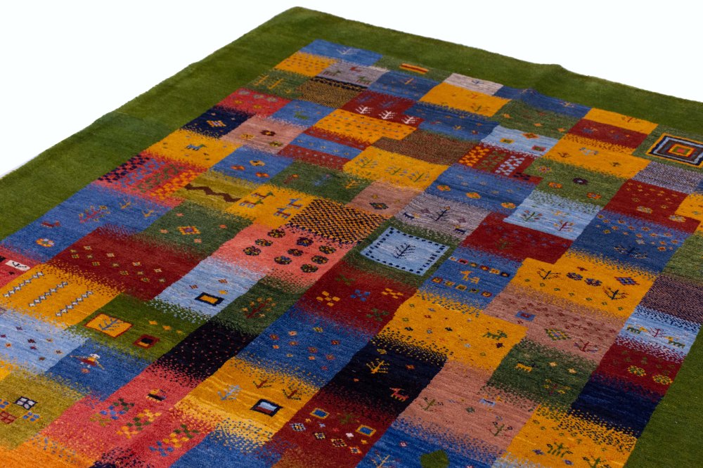 حاشیه سبز زنده؛ قاببندی چشمنواز و هماهنگ: این گبه با حاشیهای سبز رنگ، زنده و بسیار زیبا بافته شده است. حاشیهای که هم نقش قاب را برای زمینهی پرجزئیات ایفا میکند و هم با رنگهای داخلی گبه هماهنگی بصری جذابی ایجاد میکند.
