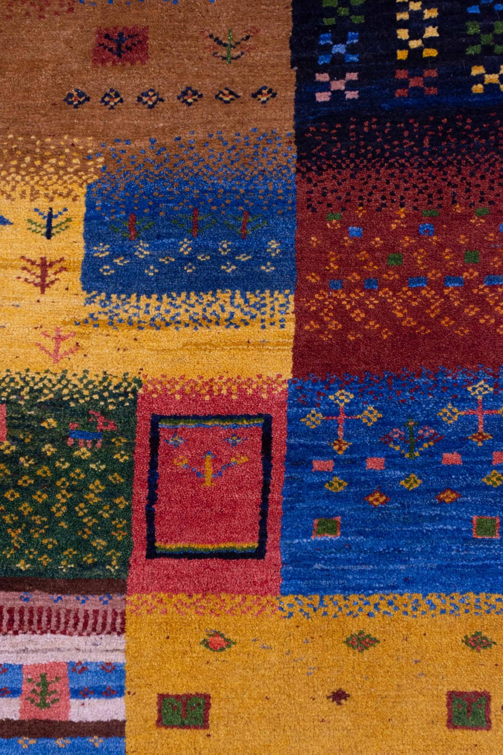 خشتهای رندوم؛ هر خشت یک جهان مستقل: زمینه این گبه از خشتهایی با اندازهها، طرحها و رنگهای کاملاً رندوم تشکیل شده است. این خشتها بدون نظم از پیش تعیینشده، در کنار هم قرار گرفتهاند و همین موضوع، به گبه حالوهوایی آزاد، پرانرژی و زنده بخشیده است.