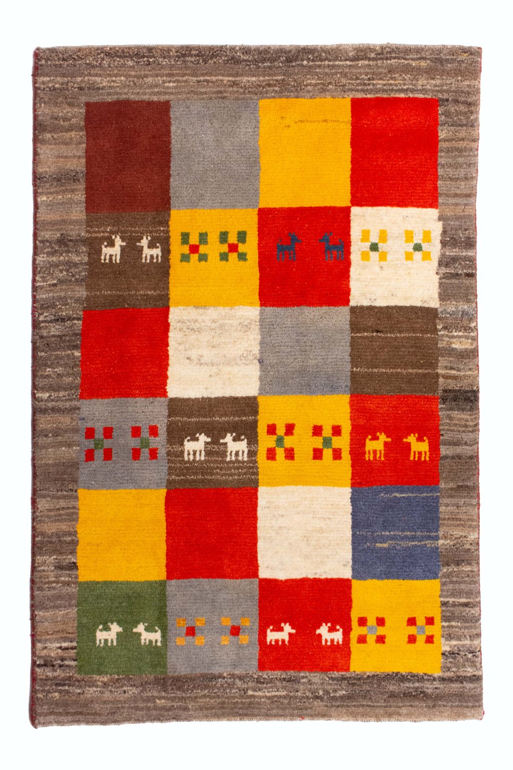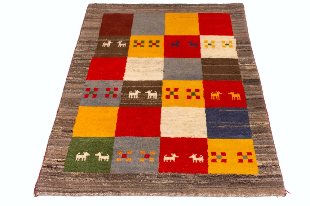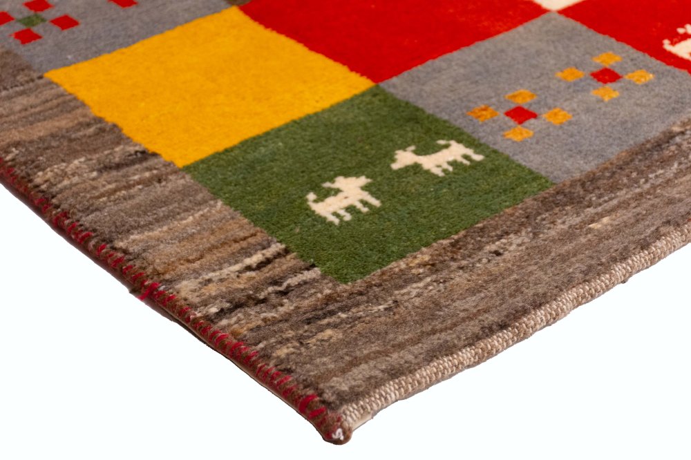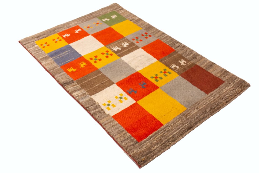 طراحی خشتی؛ نظم در دل بداهه: نقش زمینه این گبه از ۲۴ خشت تشکیل شده است که بهصورت منظم در کنار یکدیگر قرار گرفتهاند. این خشتها درون یک حاشیه به رنگ طوسی متمایل به قهوهای محصور شدهاند؛ حاشیهای آرام، خنثی و هوشمندانه که همچون قاب یک تابلو هنری، زمینهی پرتنوع و پرانرژی گبه را در بر میگیرد و باعث میشود نگاه بیننده بدون خستگی، در میان خشتها گردش کند.