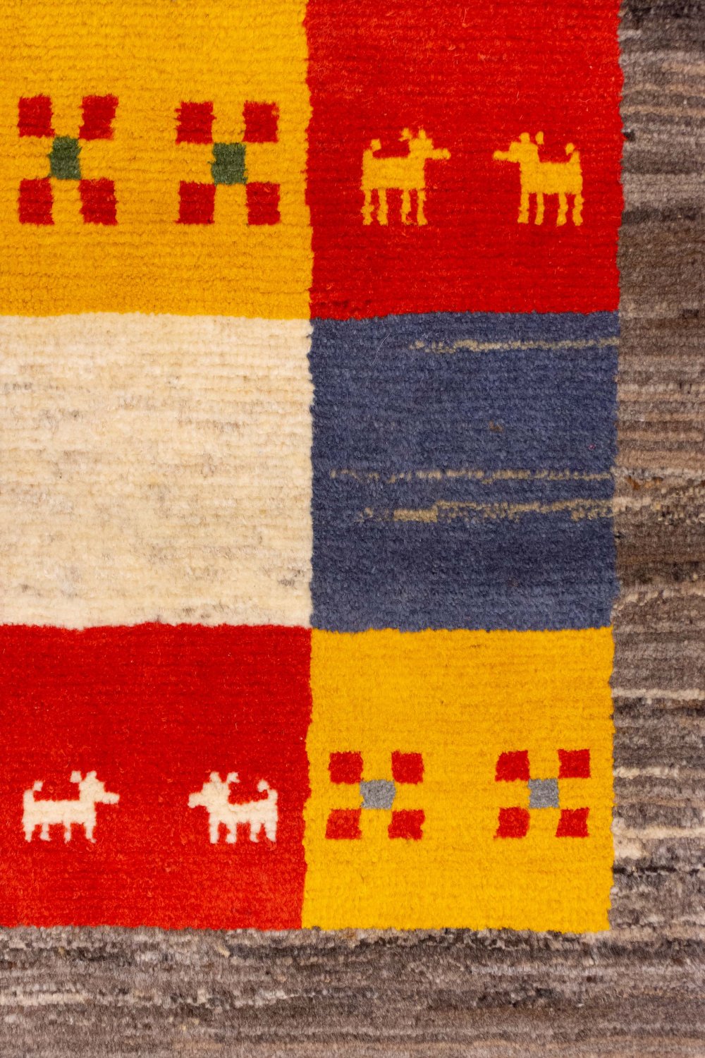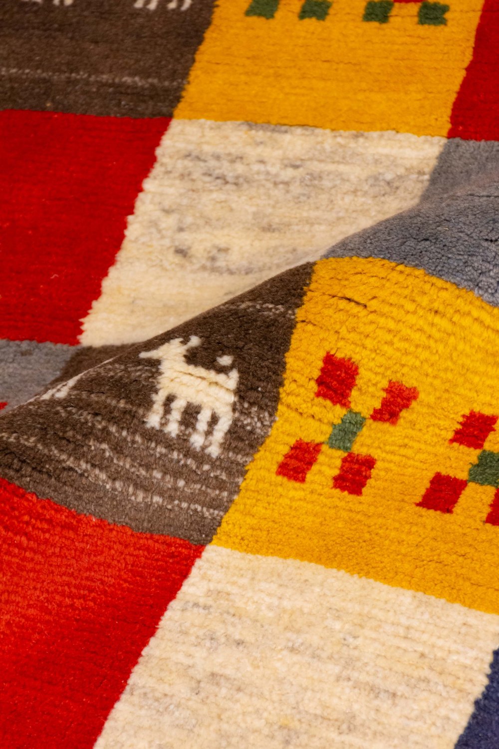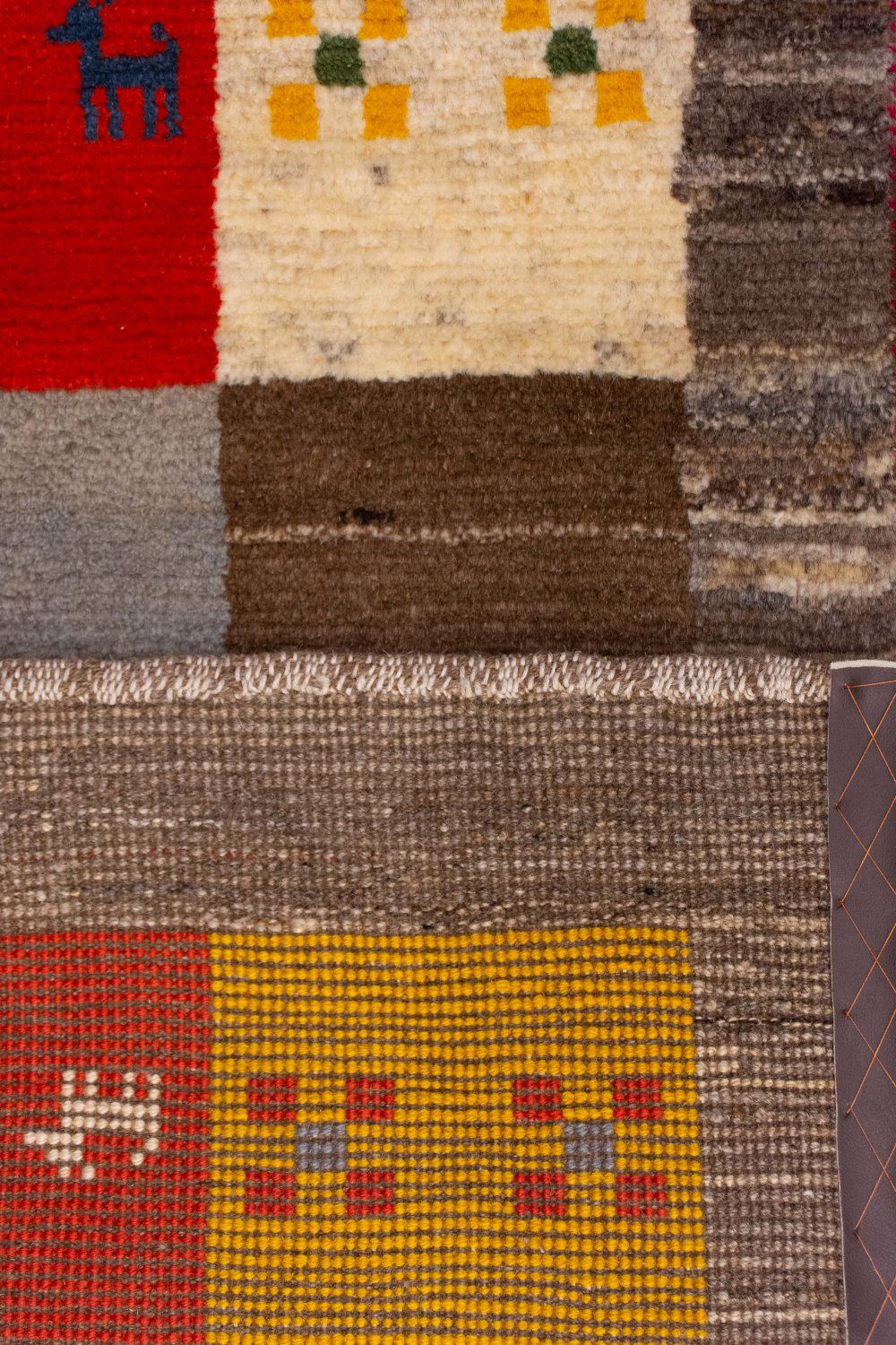 آنچه این گبه قشقایی را از بسیاری نمونههای مشابه متمایز میکند، انتخاب کاملاً رندوم و بدون ترتیب خاص رنگ خشتهاست. در این گبه، بافنده خود را به الگوی رنگی مشخصی محدود نکرده و با آزادی کامل، رنگها را بر اساس حس و لحظه انتخاب کرده است. نتیجه این رویکرد بداهه، خلق اثری زنده، پویا و بسیار متفاوت است که هر خشت شخصیت مستقل خود را دارد و در عین حال، با کلیت اثر هماهنگ است.