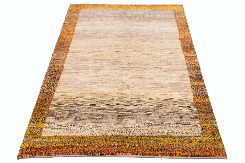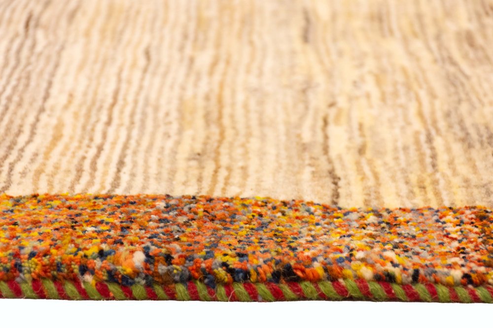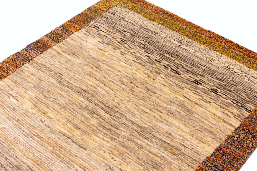 طراحی ساده اما عمیق و هنرمندانه: زمینهی اصلی این گبه به رنگ کرم طوسی خودرنگ است؛ رنگی ملایم، طبیعی و آرامشبخش که بدون استفاده از رنگهای شیمیایی و تنها با بهرهگیری از رنگ طبیعی پشم شکل گرفته است. در بافت زمینه، افکت ابرش بهچشم میخورد که باعث ایجاد سایهروشنهای ظریف و زنده شده و از یکنواختی سطح گبه جلوگیری میکند. همین ویژگی، حس طبیعی بودن و اصالت بافت دستباف را بهخوبی منتقل میکند.