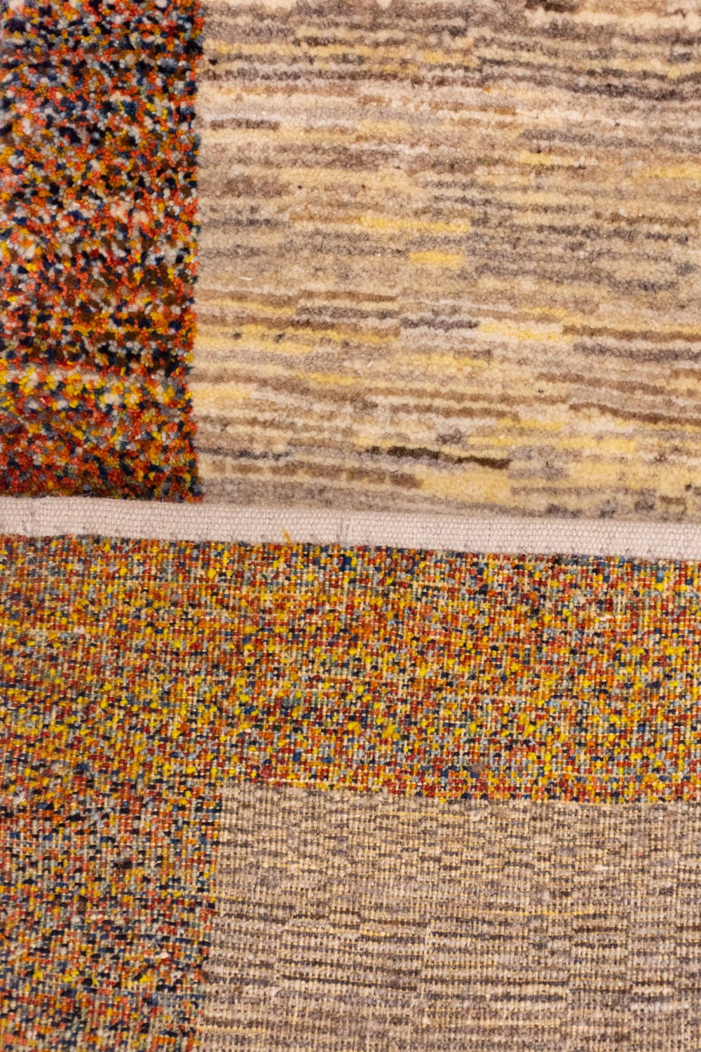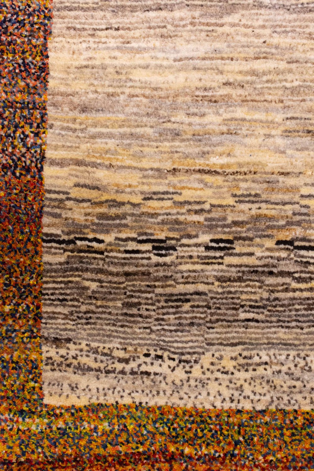 اما نقطهی عطف این گبه، بدون شک حاشیهی فلفلنمکی آن است؛ طرحی خاص و متفاوت که جلوهای کاملاً هنری به گبه داده است. منظور از فلفلنمکی، استفاده از نخهایی با رنگهای متنوع و دوندون است؛ درست مانند پیکسلهای یک تصویر دیجیتال که در کنار هم یک قاب زنده و پویا میسازند. اگر هر پیکسل را یک نخ در نظر بگیریم، هر نخ رنگی متفاوت دارد و این تنوع رنگ، حاشیهای پرانرژی و چشمنواز خلق کرده است.