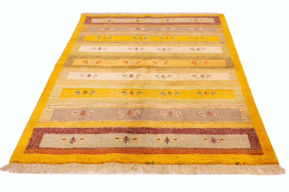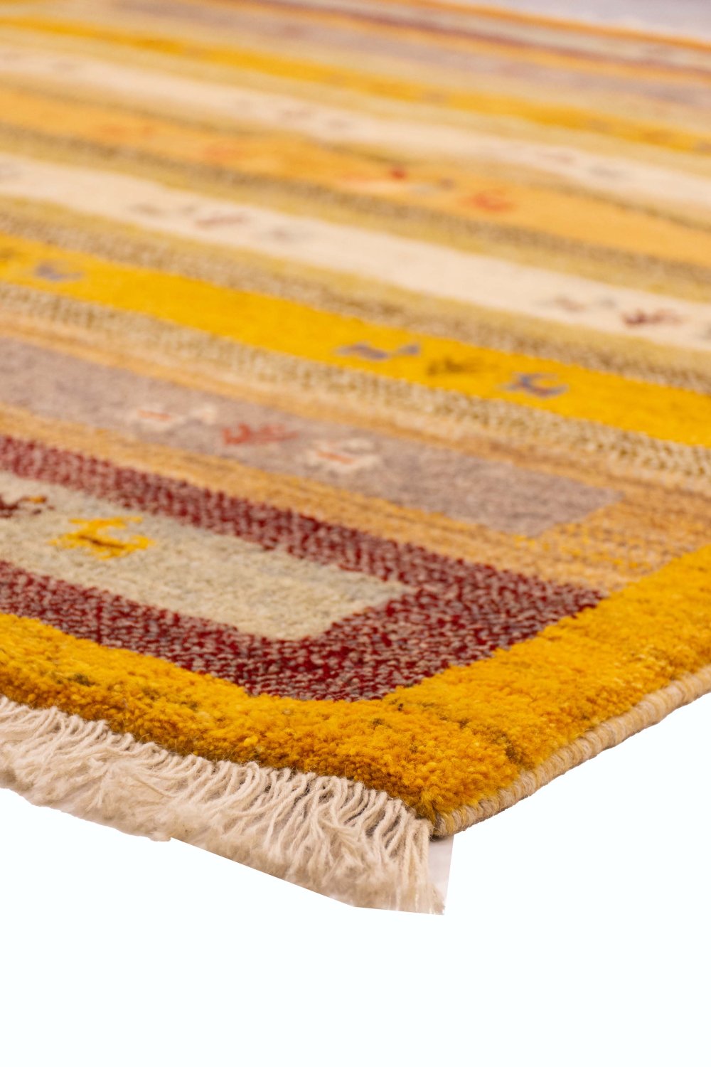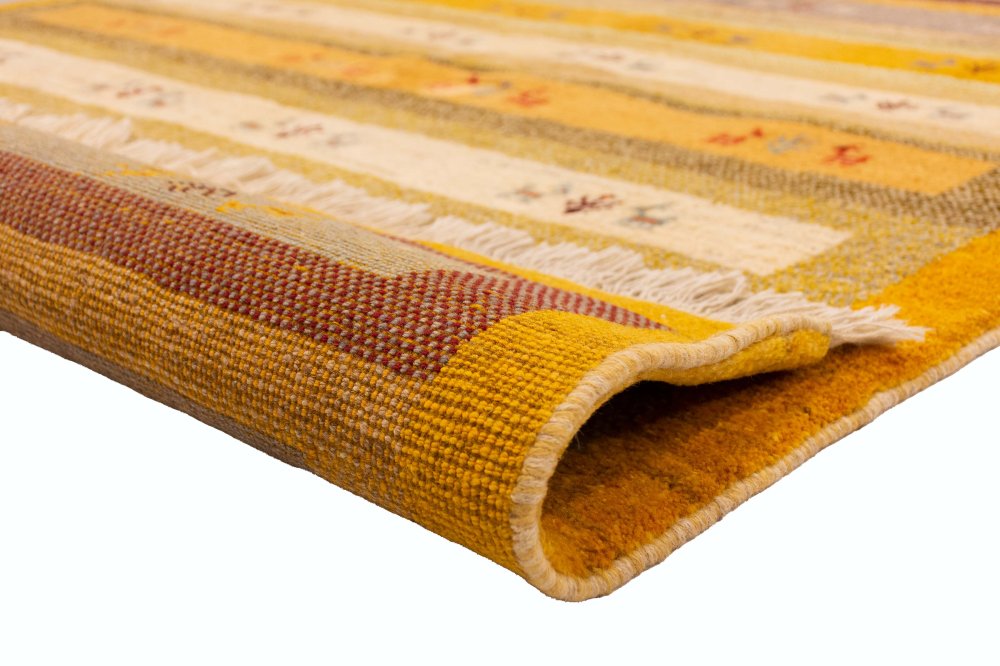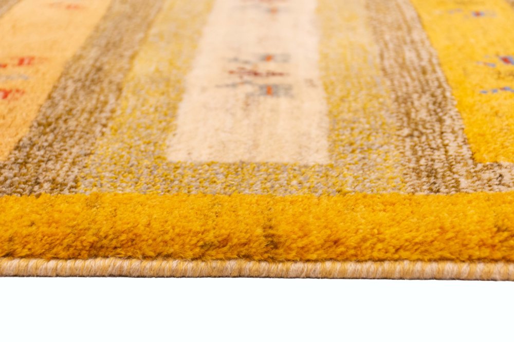 زمینه زرد؛ نماد نور و شادی: زمینه این گبه به رنگ زرد بافته شده است؛ رنگی که در فرهنگ ایرانی و بافتههای عشایری نماد نور، گرما، شادی و حیات به شمار میآید. رنگ زرد بهطور طبیعی انرژی فضا را افزایش میدهد و باعث میشود محیط روشنتر، گرمتر و سرزندهتر به نظر برسد. استفاده از رنگ زرد در کنار رنگهای گیاهی، جلوهای طبیعی و زنده به گبه بخشیده و آن را به انتخابی عالی برای فضاهایی تبدیل کرده که نیاز به انرژی و تحرک بصری دارند.