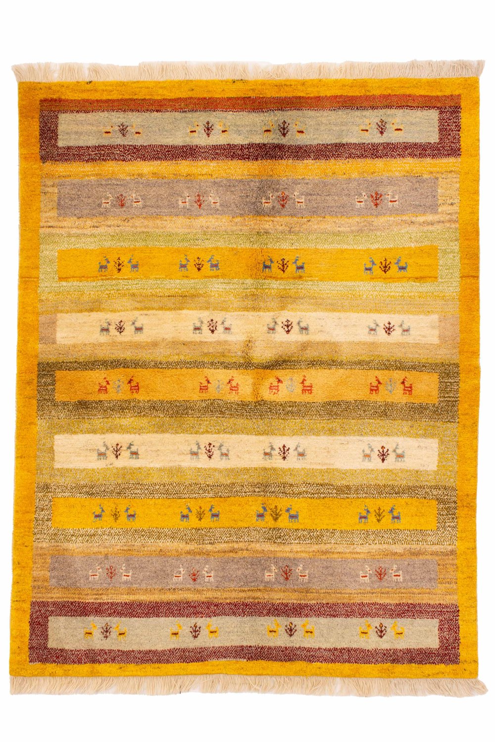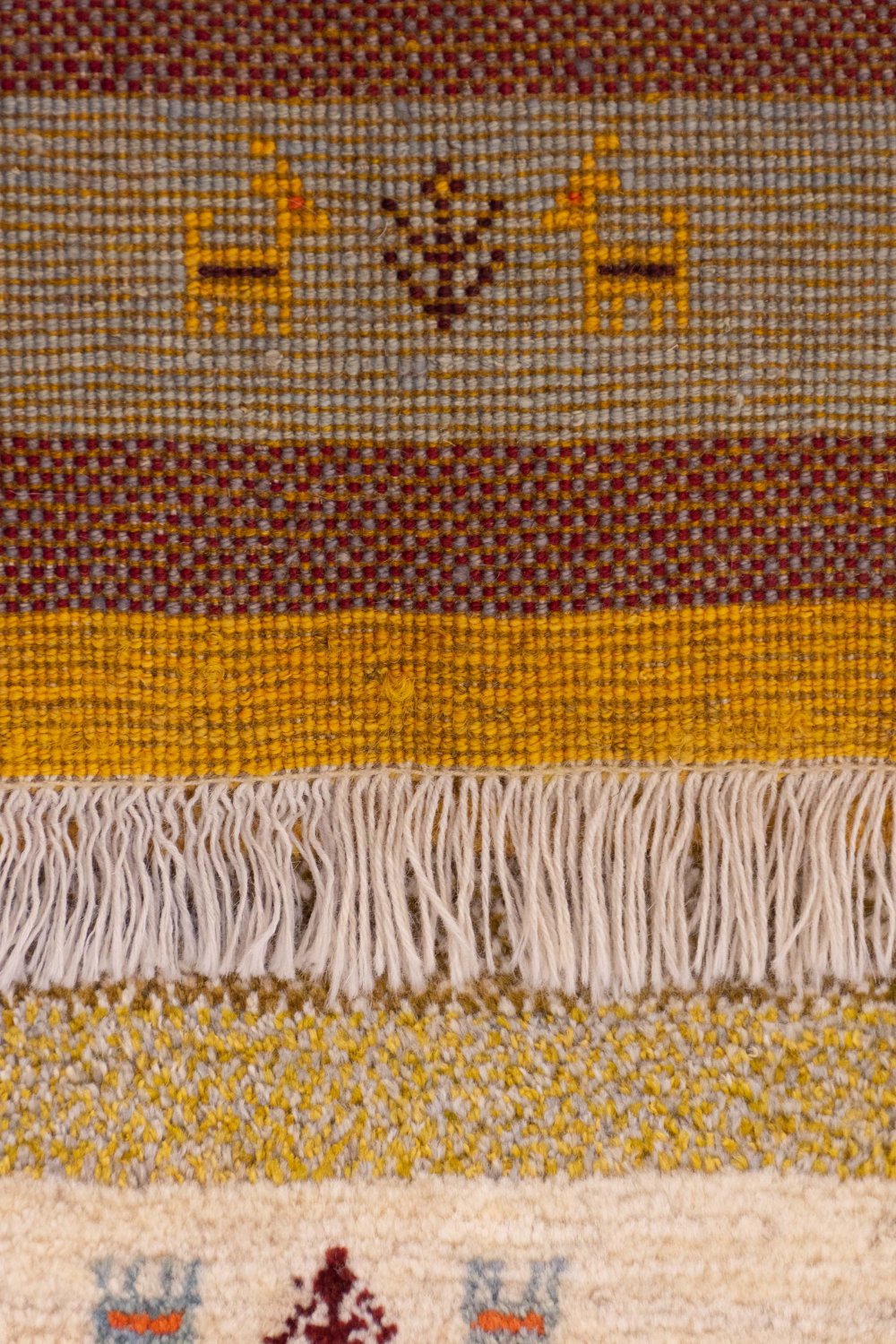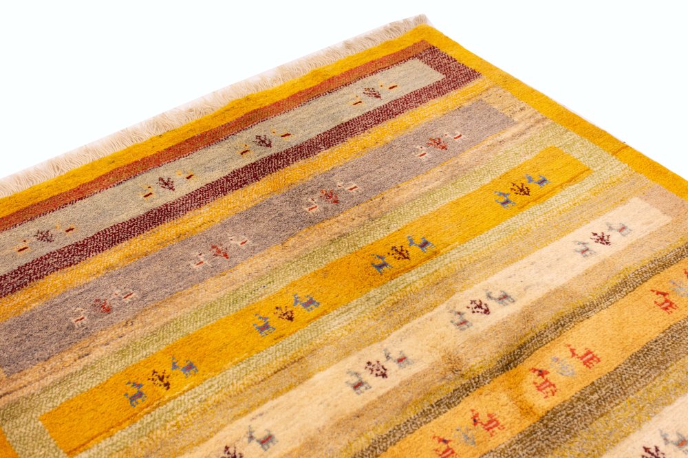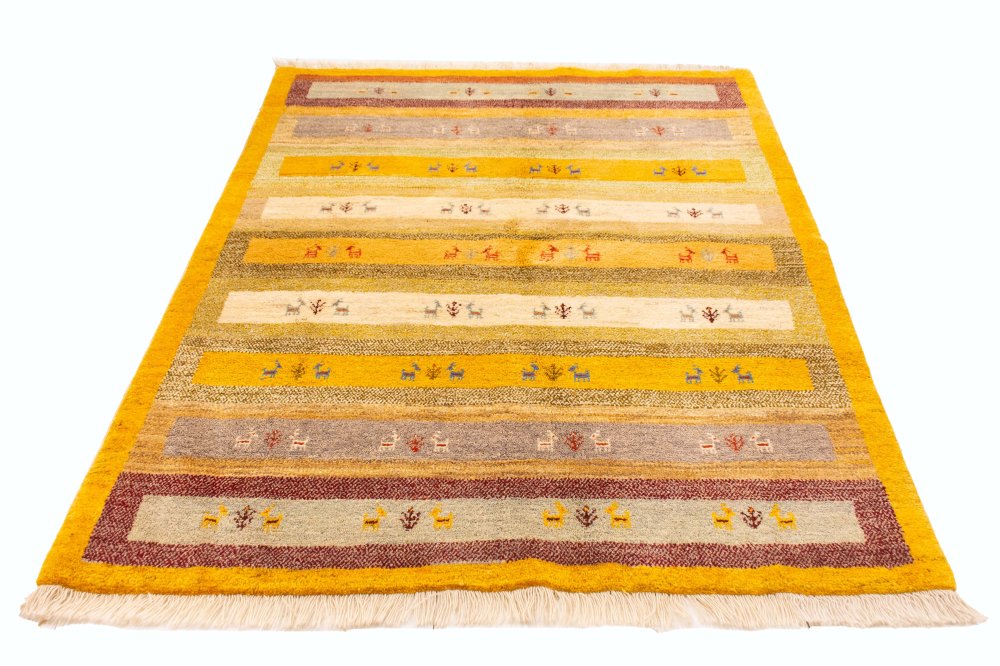 زمینه زرد؛ نماد نور و شادی: زمینه این گبه به رنگ زرد بافته شده است؛ رنگی که در فرهنگ ایرانی و بافتههای عشایری نماد نور، گرما، شادی و حیات به شمار میآید. رنگ زرد بهطور طبیعی انرژی فضا را افزایش میدهد و باعث میشود محیط روشنتر، گرمتر و سرزندهتر به نظر برسد. استفاده از رنگ زرد در کنار رنگهای گیاهی، جلوهای طبیعی و زنده به گبه بخشیده و آن را به انتخابی عالی برای فضاهایی تبدیل کرده که نیاز به انرژی و تحرک بصری دارند.