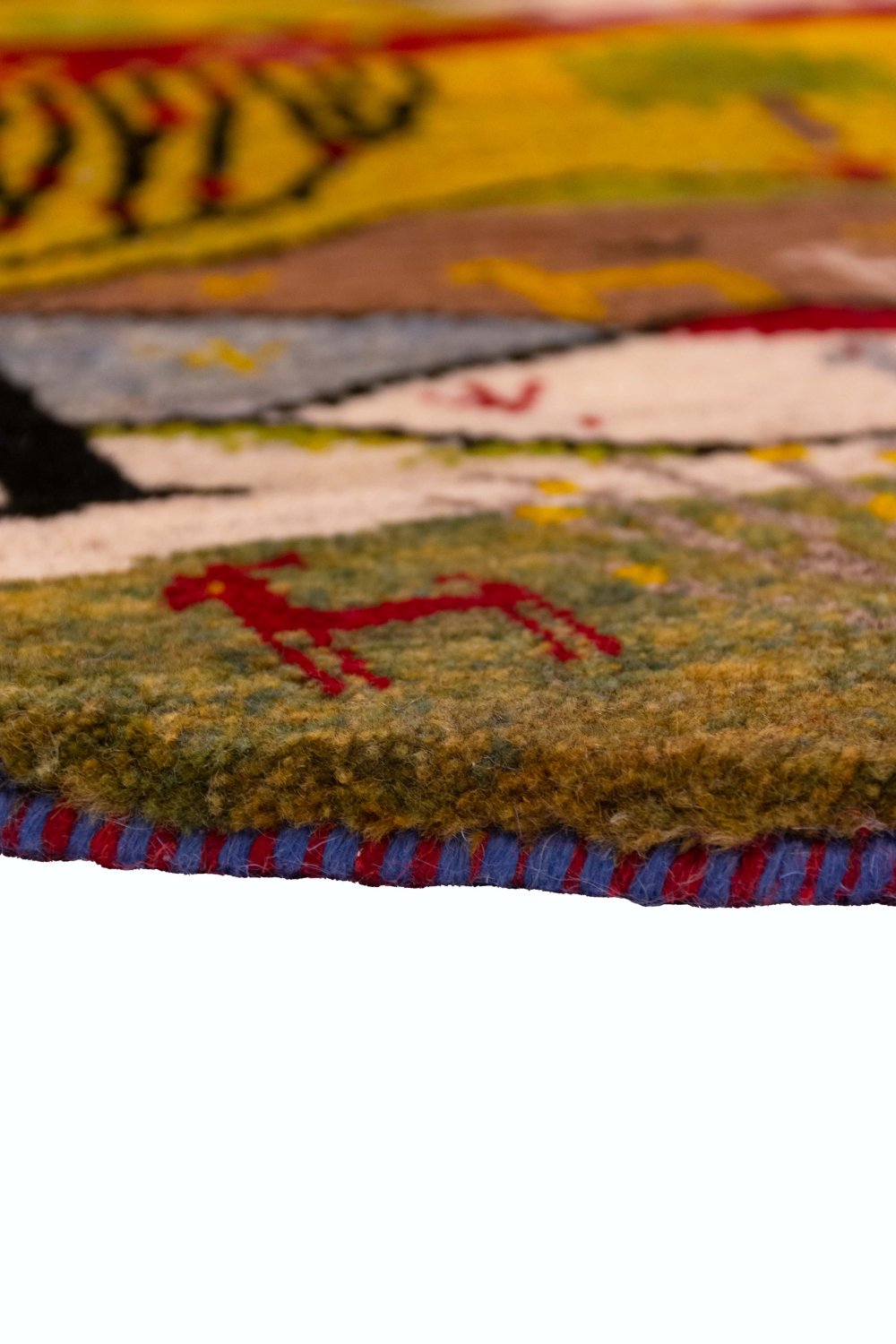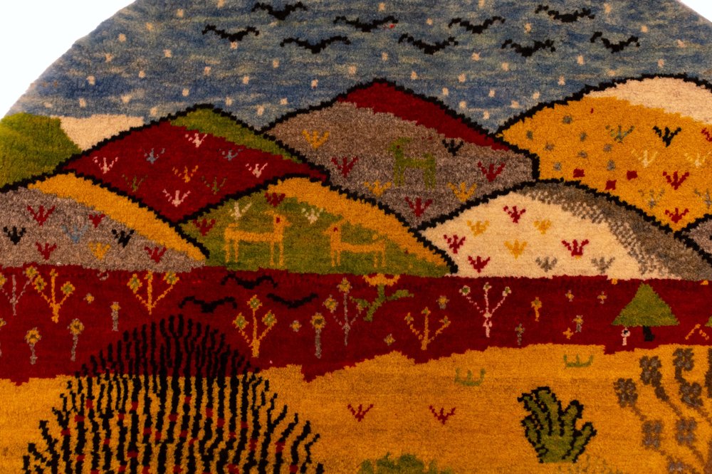 این گبه گرد دستباف قشقایی، اثری است از دل طبیعت و از روح هنرمندانهی عشایر ایرانزمین؛ گبهای که در هر گرهاش، نغمهای از زندگی، رنگ و احساس جاری است. با قطر حدود یک متر، این گبه در نگاه اول همچون تابلویی از طبیعت زنده و پرانرژی به نظر میرسد. آسمان، کوه، پرنده، گل و درخت، همه در کنار هم بافته شدهاند تا جهانی رنگارنگ و پرتحرک پدید آورند.