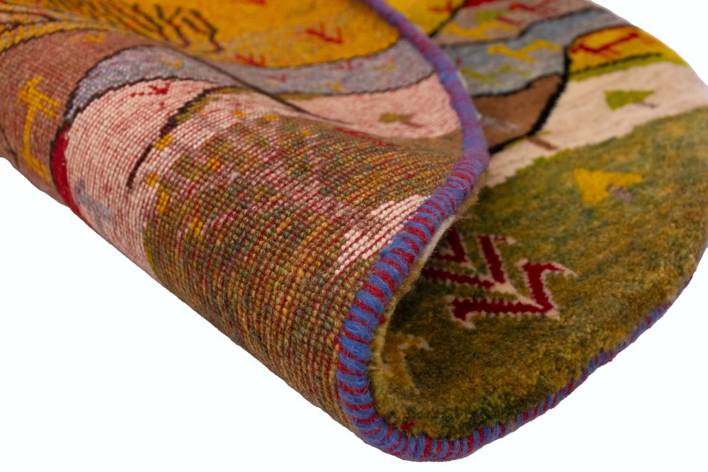 پایینتر از کوهها، طبیعتی رنگارنگ و زنده گشوده میشود. لالههای سرخ و نارنجی در گوشهوکنار گبه روییدهاند، در کنار درختان کوچک سبز که با لطافت و هماهنگی در کنار هم قرار گرفتهاند. حضور رنگهای گرم در این بخش، حس گرما، زندگی و امید را به اثر میافزاید. بافنده با چیدمان هوشمندانهی رنگها، توانسته انرژی طبیعت را به چشم و دل بیننده منتقل کند.
