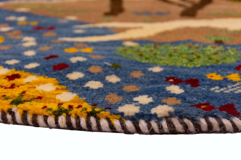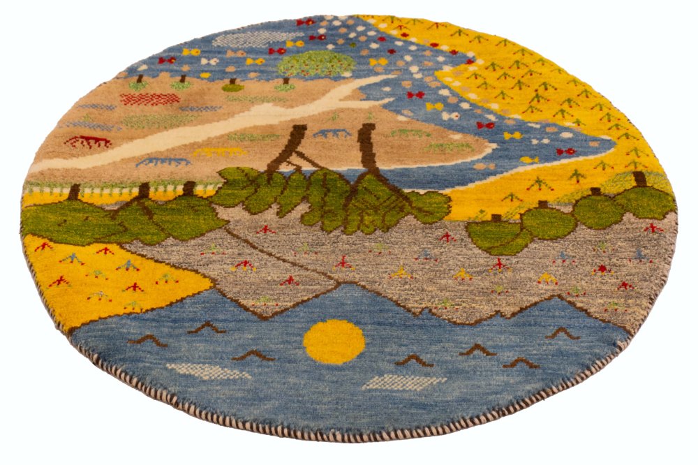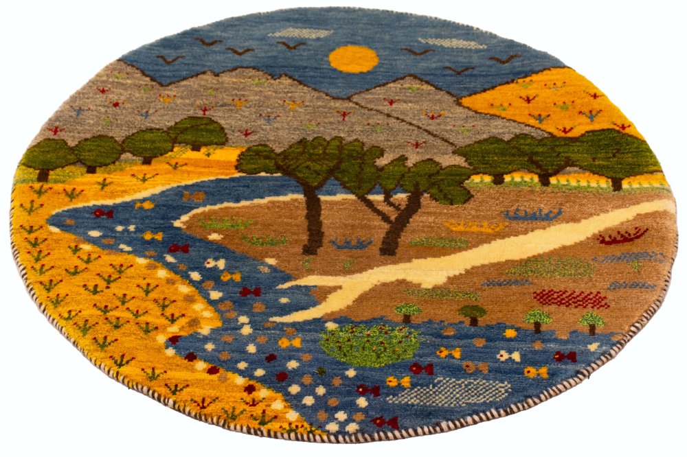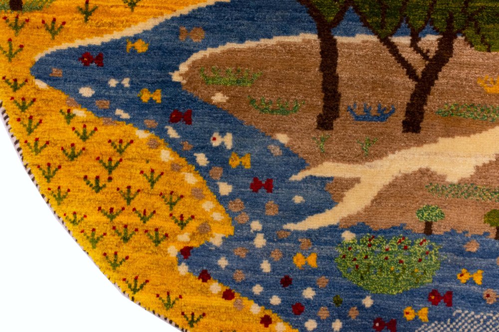 این گبه گرد دستباف، یکی از زیباترین و خاصترین آفرینشهای هنرمندان عشایر قشقایی است؛ اثری که مرز میان خیال و واقعیت را در هم آمیخته و تصویری از طبیعت را در دایرهای به قطر یک متر به نمایش گذاشته است. بافنده در این گبه، نه تنها نقش و رنگ را بهکار گرفته، بلکه روح طبیعت را در تار و پود آن دمیده است. نتیجهی این ذوق و تخیل، گبهای است که همچون رویایی زنده و پرانرژی در مقابل چشمان شما جان میگیرد.