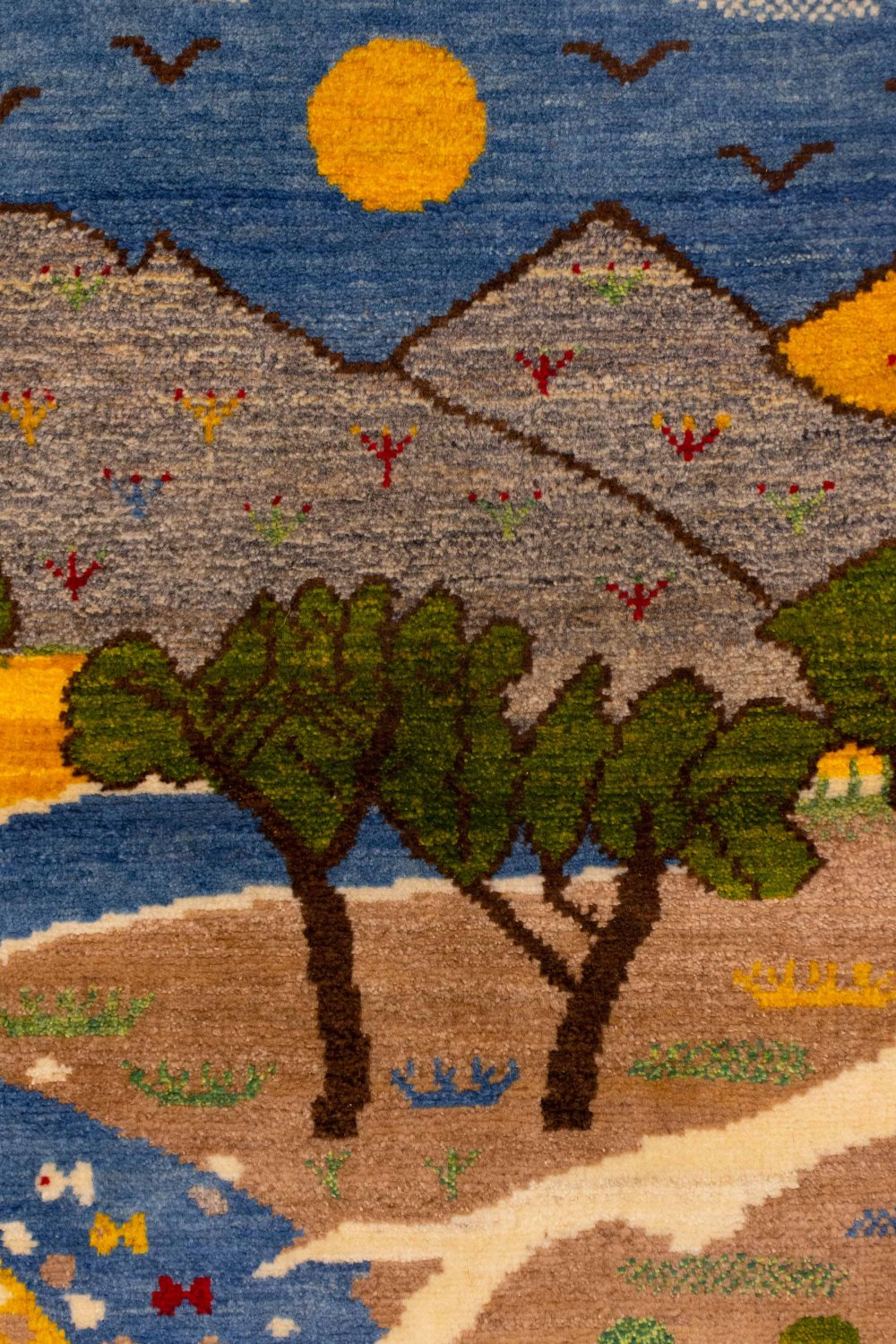 در قسمت پایینتر، رشتهکوههایی باشکوه خودنمایی میکنند. رنگ اصلی کوهها طوسی ملایم است، اما در میان آنها یک کوه زردرنگ در سمت راست میدرخشد؛ گویی پرتو خورشید مستقیم بر آن تابیده و آن را روشنتر و گرمتر کرده است. این انتخاب هوشمندانهی رنگ، نشان از دقت و ذوق بافنده دارد که با چند گره ساده، توانسته عمق و نور را در دل گبه ایجاد کند.