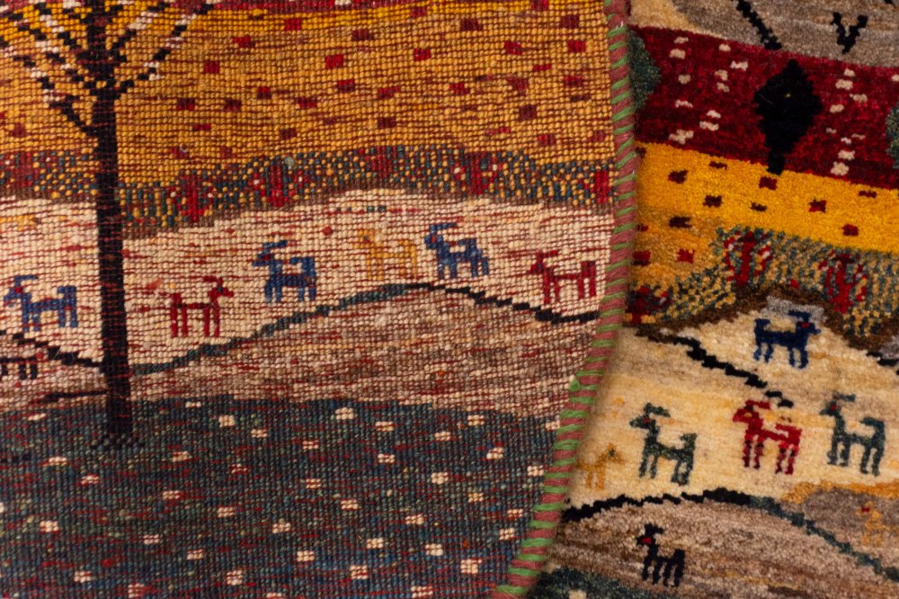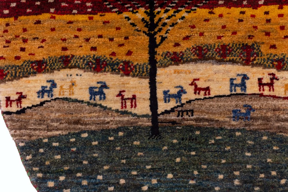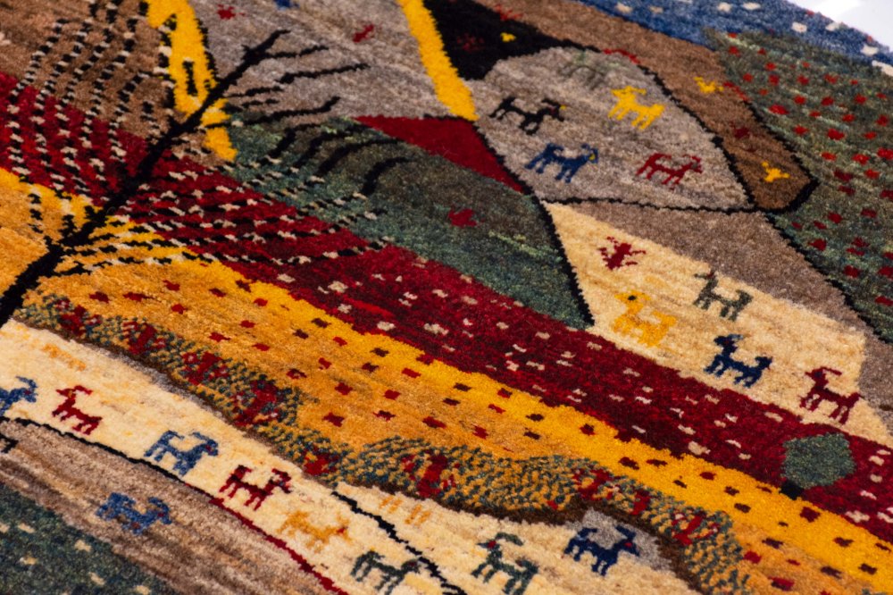 اما شاید چشمگیرترین بخش گبه، درخت بزرگ سمت چپ آن باشد. درختی که با شاخههای گستردهاش، حس زندگی، رشد و تداوم را القا میکند. درخت در فرهنگ ایرانی و در هنر قشقایی، نمادی از حیات و ریشههای محکم در زمین است. حضور این درخت در کنار عناصر دیگر، باعث میشود که گبه تنها یک اثر تزئینی نباشد، بلکه روایتی از زندگی، پیوستگی و امید باشد.