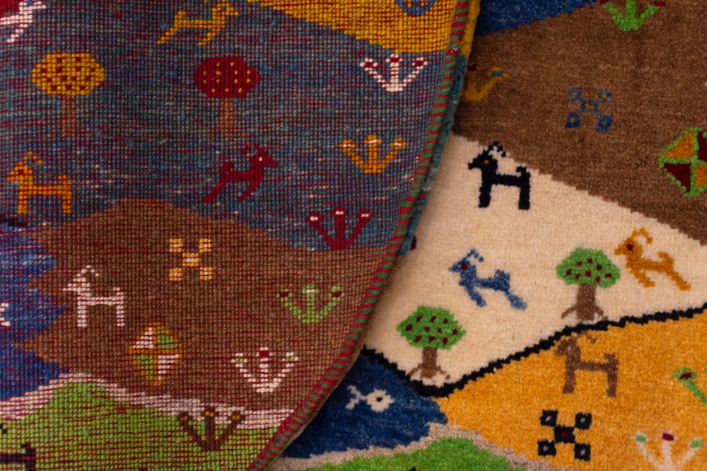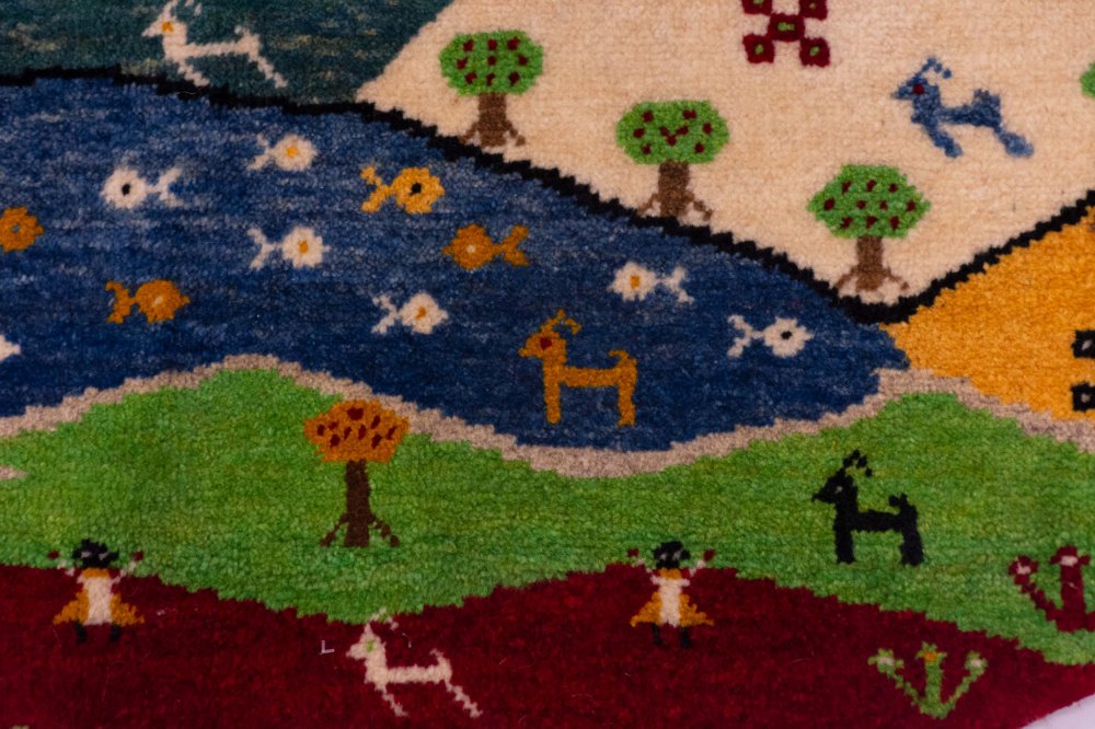 اما شاید شاعرانهترین بخش این گبه، دو آدمک کوچک و شاد در پایین آن باشند. این دو انسان، با دستان باز و چهرهای خندان، گویی در دل طبیعت میرقصند. حضورشان در میان منظره، نشانهای از ارتباط انسان با طبیعت است و شاید هم اشارهای ظریف از بافنده که خود را جزئی از این جهان زنده میداند. او نه جدا از طبیعت، بلکه بخشی از آن است؛ و با بافتن این گبه، خودش را در میان رنگها و نقشها جاودانه کرده است.