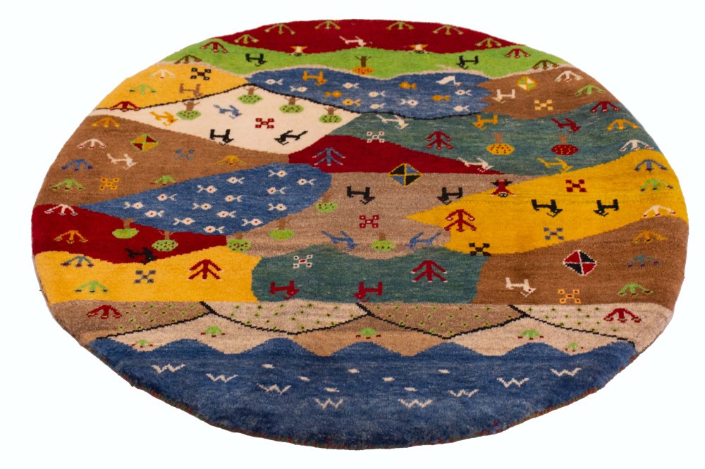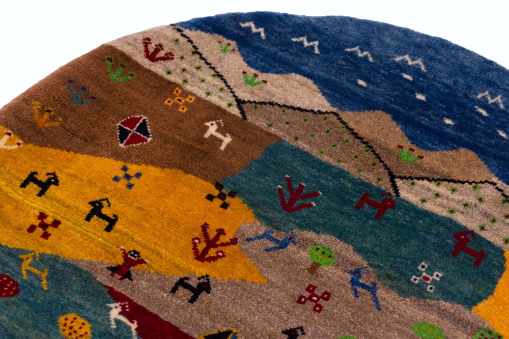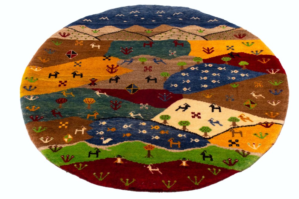 گبه گرد دستباف قشقایی با طرح طبیعت زنده، روایت زندگی، رنگ و شادی در دایرهای یکمتری: